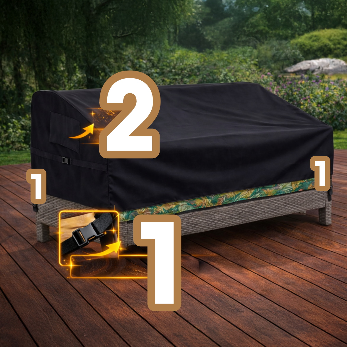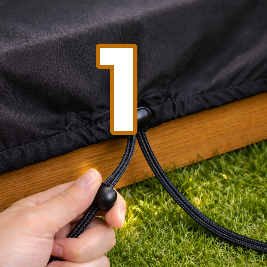 Mocowanie: Pokrowiec posiada klamry na rogach oraz sznurek z zaciskiem (1), które zapewniają stabilne i pewne zamocowanie.
