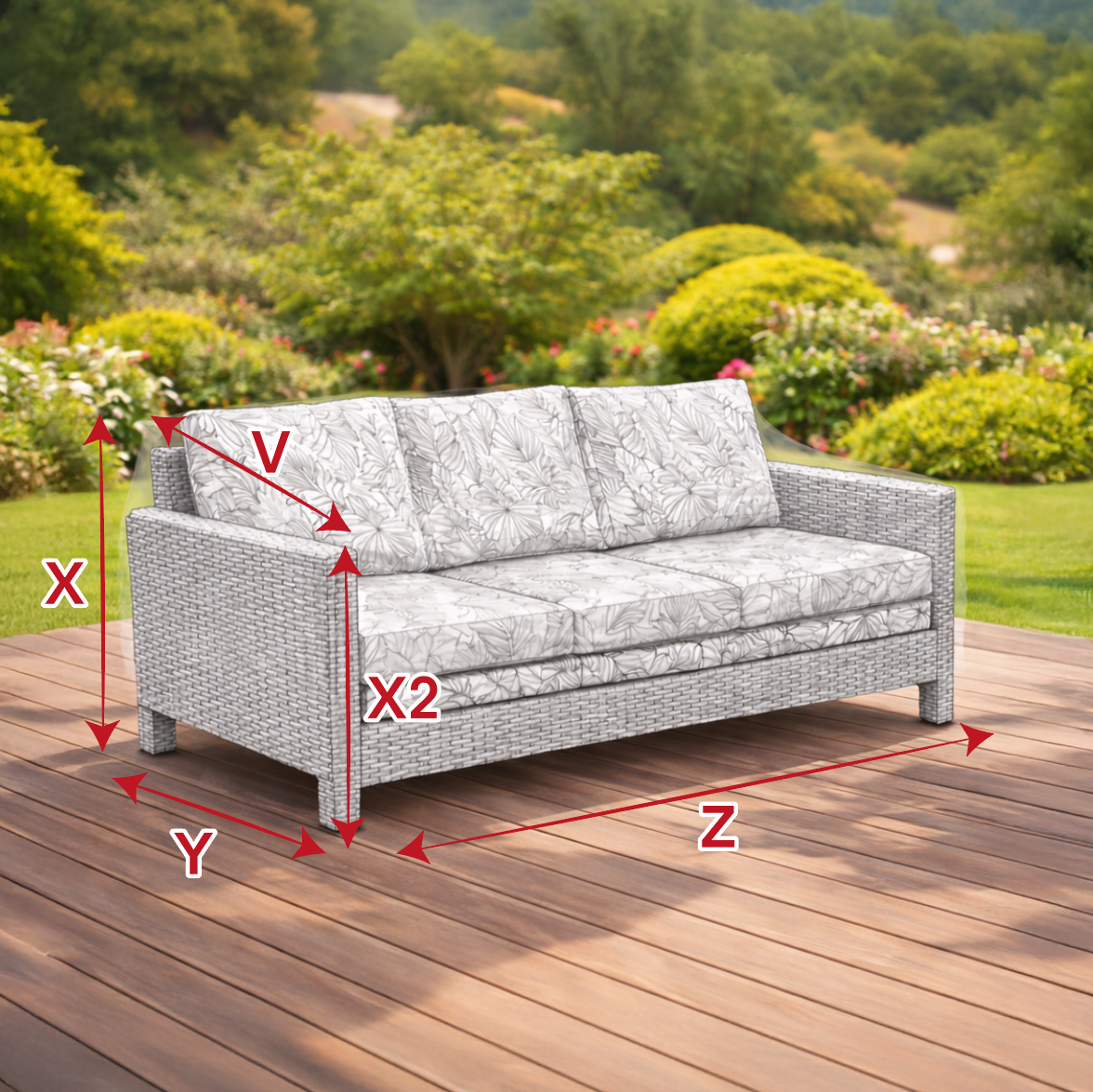 Zmierz swoją ławkę: Aby zamówić pokrowiec, zmierz wysokość, szerokość oraz głębokość ławki, wzorując się na obrazku pomocniczym. Nie sumuj wszystkich boków, tylko wymierz: X (wysokość tylnej części), Y (głębokość) oraz Z (szerokość).