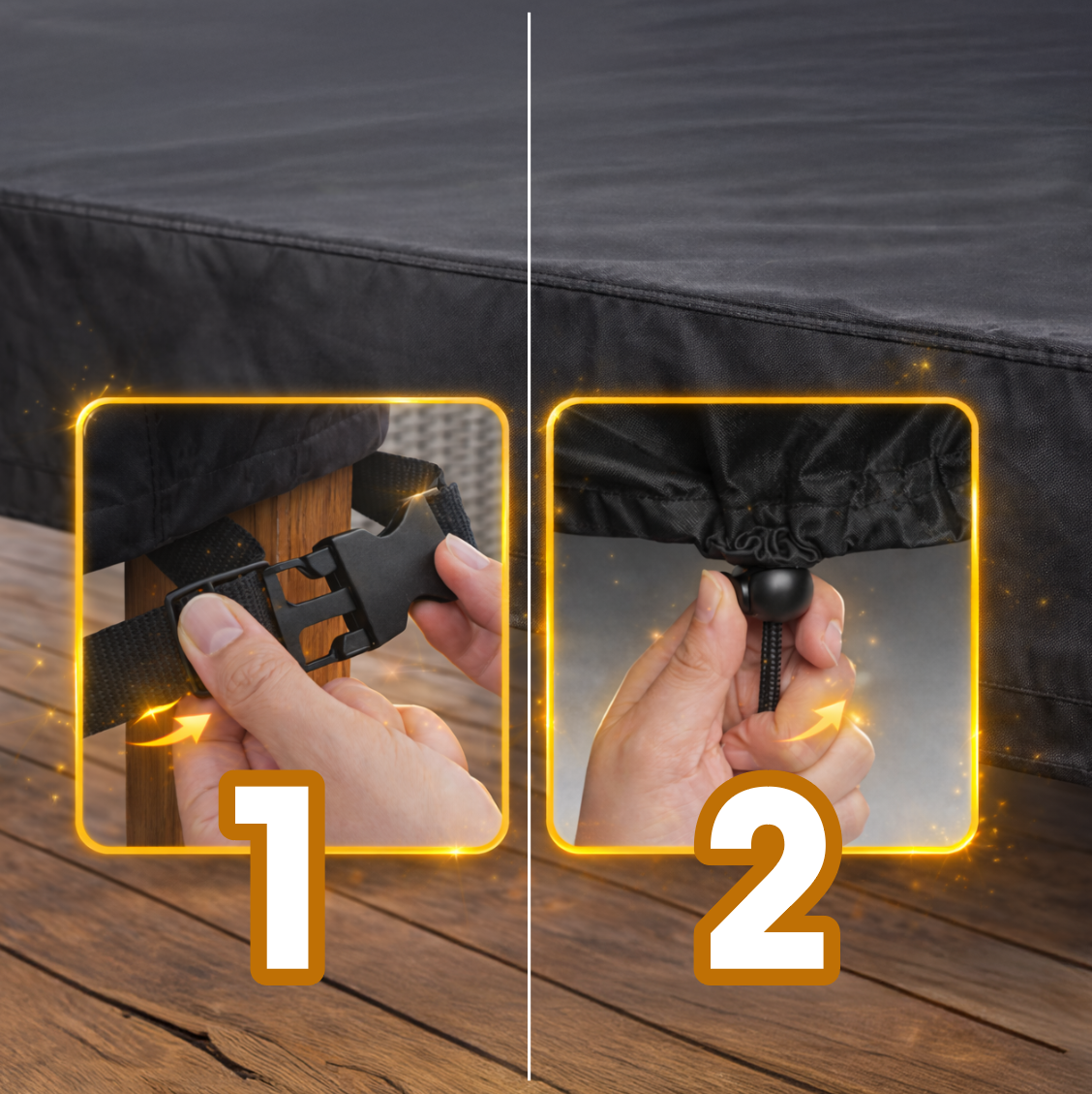 Mocowanie: Pokrowiec posiada klamry na rogach oraz sznurek z zaciskiem, aby zapewnić pewne i stabilne mocowanie.